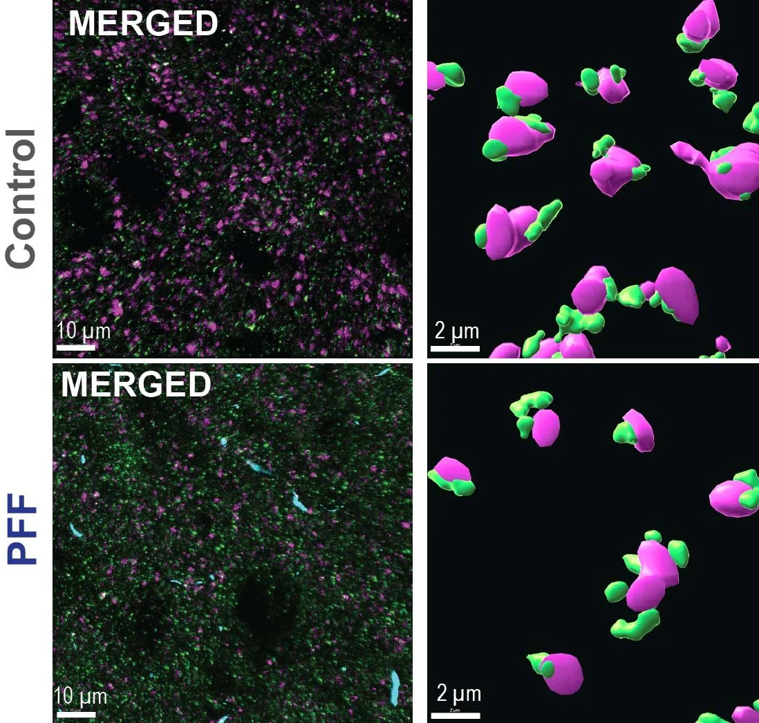 How does early formation of abnormal α-synuclein aggregates impact synaptic structure and function? We want to know if early changes in synaptic function and morphology contributes to cognitive symptoms. We show that α-synuclein aggregates cause robust and reproducible structural changes in synapses. We are also working with collaborators using electrophysiology and fiber photometry to determine how α-synuclein aggregates disrupt synaptic function, and dynamic release of neurotransmitters. Our goal is to find mechanisms to prevent or rescue synaptic defects.